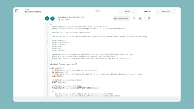 Now, the final thing needed is the actual program that will run on the MKR 1010 board. We can edit the program directly in the Arduino Cloud, by clicking on the "Sketch" tab. This will open up the built-in editor, where we can write the program directly.
