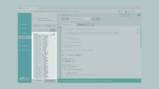 This tutorial will focus on the 3-axis accelerometer sensor of the LSM9DS1 module on the Arduino Nano 33 BLE, in order to measure the relative position of the board. This will be achieved by utilizing the values of the accelerometer's axes and later print the return values through the Arduino IDE Serial Monitor.